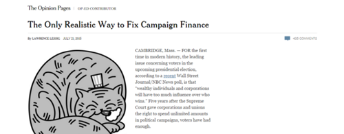 Em artigo para o New York Times intitulado “O único modo realista de consertar o financiamento de campanha” (tradução livre para The Only Realistic Way to Fix Campaign Finance), publicado em julho deste ano, antes de anunciar sua candidatura, Lessig escreveu: