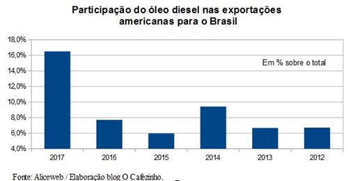 E agora a principal surpresa: o óleo diesel, nos últimos anos, tinha participação em torno de 7% nas exportações dos EUA para o Brasil.