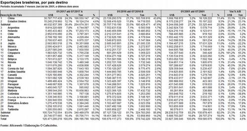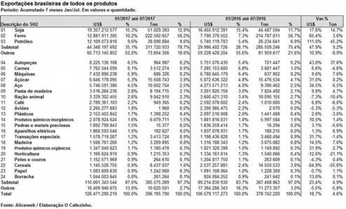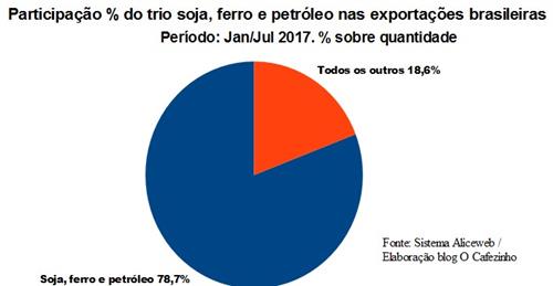 Outro dado impressionante é que o trio soja, ferro e petróleo respondeu por 79% do volume exportado pelo Brasil em jan/jul de 2017.