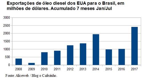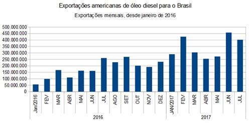 As exportações de óleo diesel dos EUA para o Brasil experimentam um crescimento muito forte a partir de março de 2016. No acumulado de sete meses de janeiro a julho, bateram um recorde histórico para o período: US$ 2,4 bilhões.