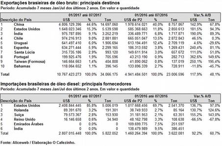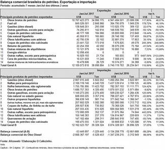 Já na exportação, o Brasil obteve uma performance formidável nos últimos sete meses: exportou 10,76 bilhões de dólares em óleo bruto de petróleo, um aumento de 117,9% sobre o ano anterior.