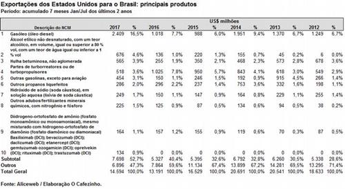 Na tabela abaixo, eu listei os principais produtos norte-americanos exportados para o Brasil. A maior parte deles são derivados de petróleo.
