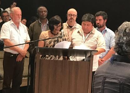 O brasileiro João Pedro Stédile, a indiana Sônia Grupta, o cubano Abel Prieto, o senador chileno Alejandro Navarro e o ator norte-americano Danny Glover.