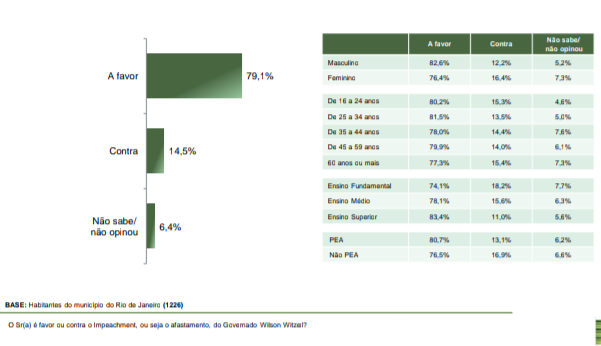 De acordo com a pesquisa, cerca de 79,1% dos cariocas são favoráveis ao impeachment do chefe do executivo e apenas 14,5% são contra.