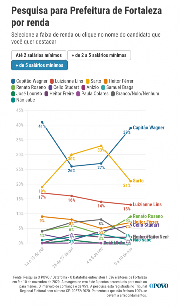 O Datafolha também mostra o derretimento da candidatura de Luizianne Lins (PT) nesses dois segmentos, em especial no eleitorado jovem de 16 a 24 anos. Além disso, a petista também apresentou queda de dez pontos no eleitorado de base histórica do PT nas capitais, aqueles que recebem até dois salários mínimos.