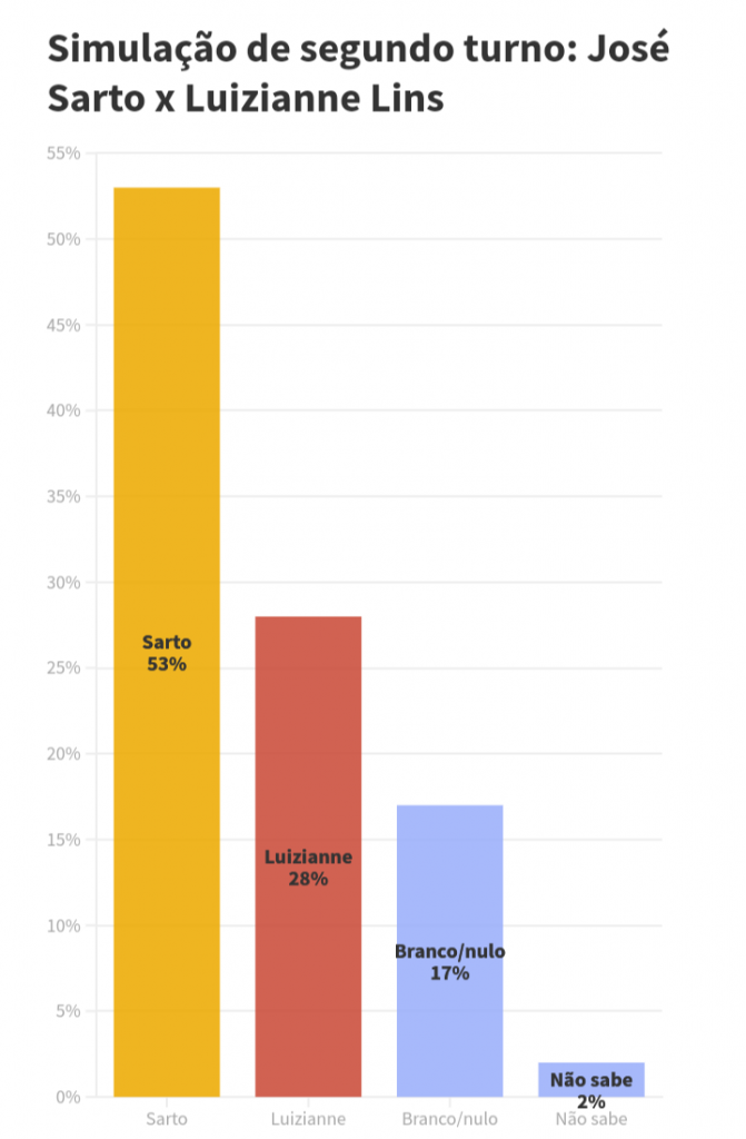 As simulações de segundo turno feitas pelo Datafolha também confirmam a temperatura máxima entre as campanhas de Sarto e Wagner. Na primeira simulação, o pedetista aparece com 47% contra 41% de Wagner. Na segunda, o pedetista ganha com bastante folga da candidata Luizianne Lins. Na terceira, Wagner vence a petista. Porém, um detalhe a ser observado, nas duas simulações em que sai vitorioso, Wagner vence com margens apertadas, o que faz jus aos 40% de rejeição da sua candidatura no Datafolha.