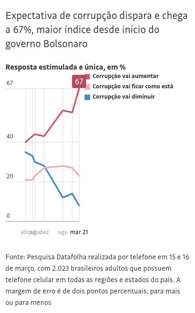 Em queda livre na aprovação, o Governo Bolsonaro também mergulha na expectativa de piora no que diz respeito a corrupção.
