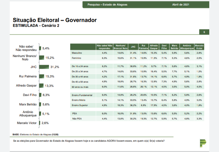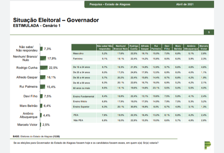 O Paraná Pesquisas ouviu 1220 eleitores em 44 municípios de Alagoas entre os dias 22 e 26 de abril de 2021. A margem de erro é de três pontos porcentuais para mais ou menos e índice de confiança de 95%.