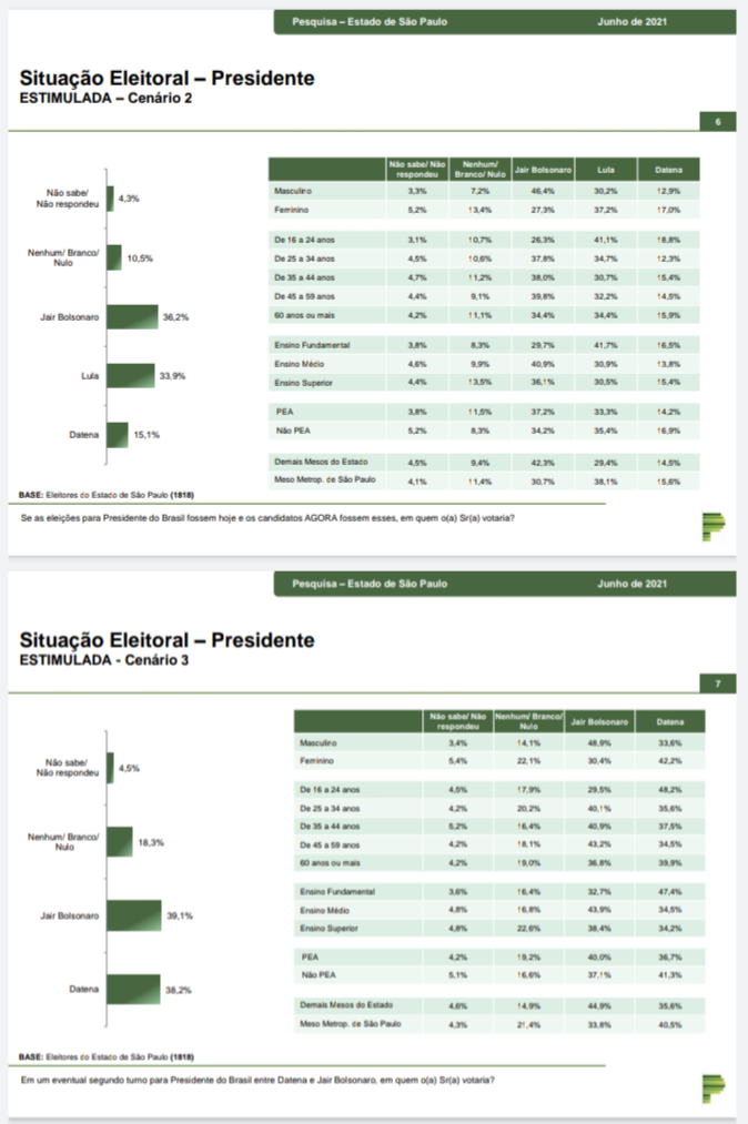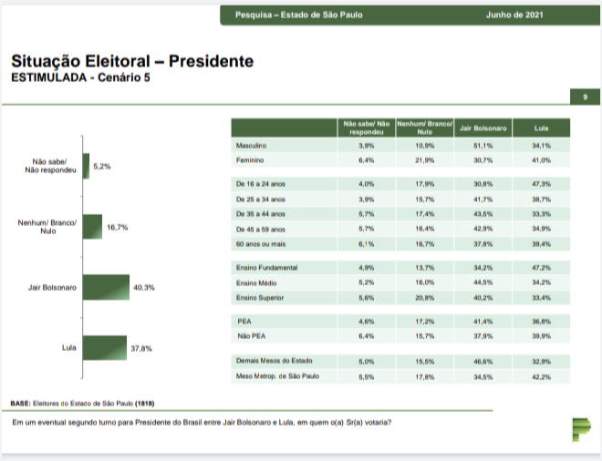 O Paraná Pesquisas ouviu 1818 eleitores paulistas entre os dias 07 a 10 de junho de 2021. O nível de confiança é de 95%.