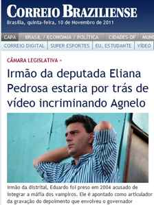 De qualquer forma, a denúncia contra Agnelo por parte de seu amigo já virou pelo avesso. Agora o escândalo é a armação feita para pegar o governador. O Correio Braziliense conseguiu o furo, que dá um novo rumo à crise: o irmão da eliana pedrosa, deputada de oposição, estaria por trás do vídeo incriminando Agnelo.
