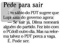 A Folha continua fomentando o dissídio dentro do PDT, alimentando a mosquinha azul que existe no seio de cada um, ao vender a tese de que o partido deveria trocar os anéis para manter os dedos. Ou seja, botar um nome novo no Trabalho, livre de pechas, para ter mais chances de não perder a vaga para outro partido. O Globo também está plantando notinhas neste sentido, como esta que aparece no Gois de hoje.