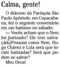 Antes de falar em Noblat (foto acima), um blogueiro sempre leal ao interesse de seus patrões, queria lhes mostrar essa notinha publicada hoje na coluna do Ancelmo Gois, que nos dá uma boa dimensão do “probrema”.