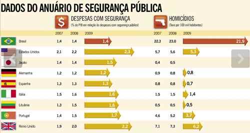 A situação é ainda mais desfavorável quando se compara o caso brasileiro com países como Alemanha e Espanha. Os dois países gastaram, respectivamente, 1,2% e 1,3% do PIB com segurança em 2009 e apresentaram taxas de, respectivamente, 0,8 e 0,7 por grupo de 100 mil habitantes.