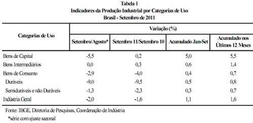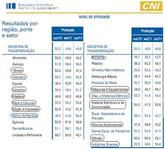 Os itens circulados são os que apresentaram aumento de produção de setembro para outubro. Note que formam a maioria e são segmentos bons. O que aconteceu foi o seguinte. Em 2009, tivemos uma queda muito grande na produção industrial brasileira, seguida de um crescimento bastante fora do normal no ano seguinte. Este ano, as coisas estão mais calmas, e teve a crise na Europa e tudo. Mas não há motivo nenhum para alarmismo catastrofista. Isso é lobby da CNI e Fiesp em busca de crédito fácil nos bancos do governo.