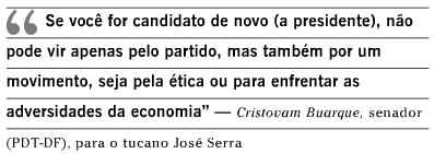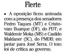 Cristóvão Buarque X Serra: Os senadores Cristóvão Buarque e Pedro Tacques foram nomes do PDT que mais tentaram faturar, junto à mídia, com os imbróglios aéreos e ongueiros de Carlos Lupi, mas a sua postura denotou um viés oposicionista sem muita preocupação em se disfarçar. Nos últimos dias, alguns movimentos desses senadores reforçam essa tendência, que revela um pouco sobre os bastidores políticos de Brasília. Reproduzo abaixo, três notas que catei no Globo. A primeira foi publicada no Ancelmo, sexta; as outras duas foram publicadas sábado e domingo no Panorama.