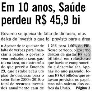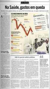 O Globo hoje publica uma matéria bem espertinha. Os repórteres verificaram que a aplicação de recursos para a saúde, pelo governo federal, correspondeu a 1,66% do PIB, e que isso representava uma queda de 0,1% sobre o percentual registrado em 2000, quando a Saúde consumiu 1,76% do PIB, e não perdeu tempo. Lascou a manchete na área mais nobre do jornal, a página 3.