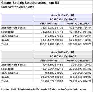 Observem. Os gastos com Saúde em 2000, em valores atualizados, corresponderam a R$ 45,55 bilhões. Hoje estão em R$ 57,2 bilhões. A diferença mais brutal, porém, ocorre quando somamos as quatros grande funções sociais da União: assistência social, educação, saneamento e saúde. Em 2000, essas funções somaram (em valores atualizados!) R$ 79,75 bilhões. Em 2010, saltam para R$ 138,58 bilhões. Só a Assistência Social, cuja natureza se entrelaça com a da Saúde, registrou uma alta de R$ 9,98 bilhões em 2000 para R$ 40,67 bilhões.