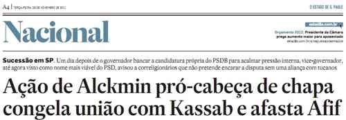 Esse destaque que o Estado de S. Paulo dá ao caso tem uma função interessante , que é derrubar a candidatura própria do PSD associando Kassab e seu candidato a corrupção , e , também os sonhos presidenciais de Serra , como sabemos a mídia oposicionista sempre está ao lado de quem tem a caneta e a chave do cofre no estado de São Paulo .