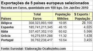 A exportação total da Bélgica em 2010 foi de $ 308 bilhões de euros, o que para uma população de 10,9 milhões de habitantes configura uma exportação per capita de $ 28,15 mil euros, mais de cinco vezes superior a qualquer dos outros países citados. Ou seja, a dívida pública belga pode até ser superior a de outros países, mas a geração de divisas realizada por esse pequeno e enérgico país é incomparável!