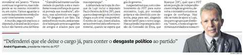 Caríssimo, estou entre a cruz e a espada. Ao mesmo tempo em que acho que o tempo dele já era, e que o desgaste para o governo é grande, desejo muito que Dilma diga não à degola. Acho que seria um balde de água gelada no PIG e na oposição oportunista.