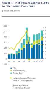 Quanto ao investimento estrangeiro entrando nos países em desenvolvimento, o relatório do Banco Mundial observa que não alcançou ainda os níveis registrados em 2008, de US$ 614 bilhões; este montante deve ser ultrapassado somente em 2013, quando a estimativa é de que US$ 660 bilhões sejam investidos nos países em desenvolvimento, com China e Brasil ocupando um lugar especial. O Brasil recebeu US$ 48 bilhões em 2010, contra US$ 185 bilhões que entraram na China e US$ 43 bi na Rússia, primeiro e terceiro lugar, respectivamente. Os investimentos estrangeiros têm se concentrado particularmente nos Brics, que absorveram 60% de todo dinheiro investido em nações emergentes no ano passado.