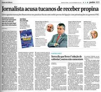 Outro destaque na mídia foi a publicação, pela Folha, de matéria sobre o livro de Amaury, rompendo o estrondoso silêncio que vinha perdurando nos últimos dias. A reportagem, contudo, se esmera em atacar Amaury, repetindo pleonasticamente umas quatro ou cinco vezes que ele está sendo investigado e processado por “quebra de sigilo”, e que teria trabalhado ou quase trabalhado na campanha de Dilma Rousseff em 2010. Também tenta acobertar os indícios de ligação entre as transferências milionárias registradas para integrantes do PSDB e familiares de Serra e o processo de privatização. E dá destaque à agressiva defesa de Serra. Trata-se, enfim, de uma peça jornalística em defesa mal disfarçada dos tucanos envolvidos nas denúncias.