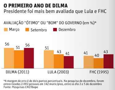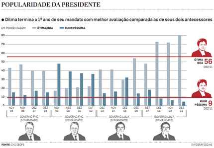 Abaixo dois infográficos, na Folha e Estadão, comparando a popularidade de Dilma à de FHC e Lula em igual período do primeiro mandato. Dilma está bem na fita, com índices superiores a seus dois antecessores.