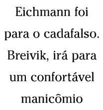 Hoje um artigo de Daniel Aarão Reis trata daquele monstro da Noruega, Breivik Behring, que matou 76 pessoas. Ainda não achei um link para a íntegra do artigo, mas a síntese do texto é a sua conclusão. Ele faz uma comparação à condenação de Eichmann, um nazista que, julgado pelo tribunal de Nuremberg pela matança de milhões de judeus em campos de extermínio, alegou que apenas cumpria ordens. E finaliza, com frase que vai copiada em destaque na página: