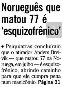 Eu quero comentar este caso porque, há algumas semanas, quando o tribunal que julga o assassino havia decidido que ele era esquizofrênico, o Globo também publicou uma chamada na primeira página, no dia 30 de novembro de 2011, expressando o mesmo incômodo.
