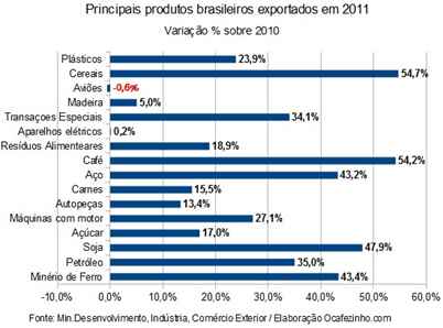 Segundo números do sistema Alice, banco de dados público do Ministério do Desenvolvimento, as exportações brasileiras totalizaram $ 256 bilhões em 2011, alta de 27% sobre o ano anterior. Cresceram praticamente todos os itens. Apenas a exportação de aviões se manteve estável. As vendas de máquinas com motor, autopeças, aço e aparelhos elétricos registram altas significativas. A de máquinas, por exemplo, cresceu também 27%. Entretanto, como não foram altas tão grandes como a de ferro, petróleo, soja e café, produtos básicos, o percentual dos industrializados caiu. [/s2If]