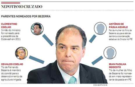 Quanto aos outros parentes na reportagem, entenda-se o seguinte: pai da mulher do filho e tio da mulher do filho não são parentes. Isso é ridículo. Além disso, já não tem ligação nenhuma com a pasta. Quanto ao tio do ministro, trata-se de uma simples comissão não-remunerada sobre irrigação e o tio passou a vida defendendo a bandeira da irrigação. Não há nada de ilegal, imoral ou aético. O irmão de Fernando é diretor da Codevasf antes da chegada de Bezerra ao ministério, por nomeação de Lula, e assumiu interinamente a presidência por ser o diretor mais antigo da instituição.