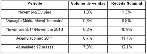 Observe a variação sobre o ano anterior, tanto no mês quanto no acumulado. Em novembro de 2011, o volume de vendas cresceu 6,8% sobre o mesmo mês de 2010. No acumulado 12 meses, alta de 7% em volue de vendas e 12% em receita nominal. Lembrando: o ano de 2010 foi um ano de vigoroso crescimento econômico, um dos melhores anos da história do país.