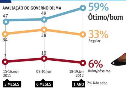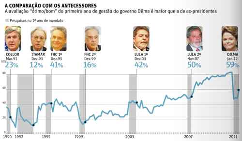 Ao completar um ano no Planalto, Fernando Collor tinha 23% de aprovação. Itamar Franco contava 12%. Fernando Henrique Cardoso teve 41% no primeiro mandato e 16% no segundo. Luiz Inácio Lula da Silva alcançou 42% e 50%, respectivamente. De acordo com o novo levantamento, a avaliação de Dilma melhorou entre homens e mulheres e em todas as faixas de idade, renda familiar e escolaridade. Sua aprovação agora é de 62% no eleitorado feminino e de 56% no masculino.