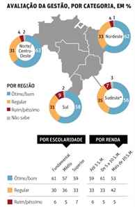 A presidente alcançou um equilíbrio entre os eleitores da base e do topo da pirâmide social. Tem 61% de ótimo e bom entre os que estudaram até o ensino fundamental e 59% entre os que chegaram ao ensino superior. Na divisão por renda familiar, o maior avanço foi na faixa de cinco a dez salários mínimos: 16 pontos de melhora, atingindo 61% de aprovação.