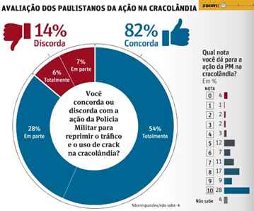 Ouvidos pelo Datafolha na quinta e na sexta, 82% dos paulistanos concordam com a ação da PM para tentar desbaratar o tráfico e o consumo de crack na região central de São Paulo.