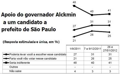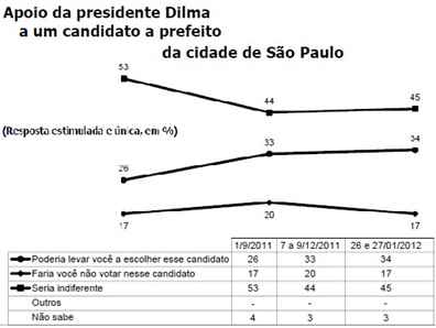 - O apoio de Dilma levaria 34% dos paulistanos a votarem num candidato à prefeitura de SP. Neste quesito, Alckmin tem apenas 31%. Ou seja, Dilma tem mais força política em São Paulo que o próprio governador.