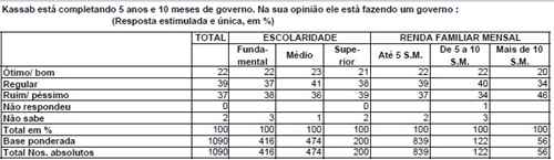 A tabela abaixo é fundamental para analisar uma possível influência de Kassab em sua sucessão. Repare que a rejeição ao prefeito é forte em todas as faixas de renda, mas sobretudo junto aos que ganham mais de 10 salários; neste segmento, 46% consideram seu governo ruim ou péssimo.