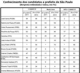 Repare que Serra é “muito bem” conhecido por 73% dos paulistanos, contra apenas 8% que conhecem “muito bem” Haddad. Matarazzo é “muito bem” conhecido somente por 4%, Bruno Covas por 5%.