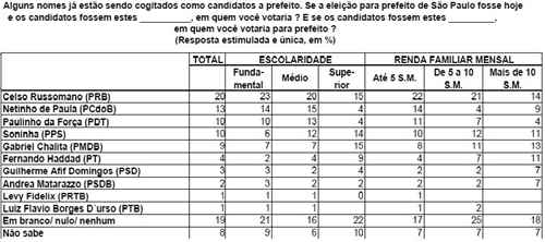 - Soninha tem 10% de intenções de voto; disputando o primeiro lugar entre o eleitorado com ensino superior, com 14%.