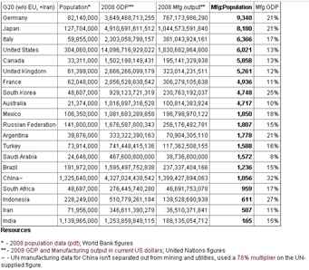 Eu achei um blog de economia estadunidense que explica o seguinte: não é mais sequer correto chamar os países mais desenvolvidos de “países industrializados”. Há anos, as indústrias destes países vem migrando para nações mais pobres, onde o custo da mão-de-obra é menor. Usando números oficiais, a autora faz uma tabela com dados dos países que integram o chamado G20. Na tabela, vemos na última coluna da direita a participação percentual das manufaturas (ou indústria de transformação) no produto interno bruto dos países.