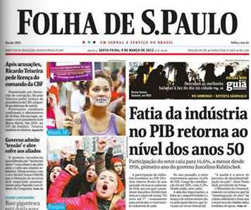 Folha, apenas uma manchete. A manchete da edição de sexta-feira (9/3) da Folha de S. Paulo remete o Brasil de volta aos meados do século passado, ao anunciar que “fatia da indústria no PIB retorna ao nível dos anos 50”. A explicação, logo abaixo, informa que a participação do setor industrial no Produto Interno Bruto caiu para 14,6%, “a menor desde 1956, primeiro ano do governo Juscelino Kubitschek”.