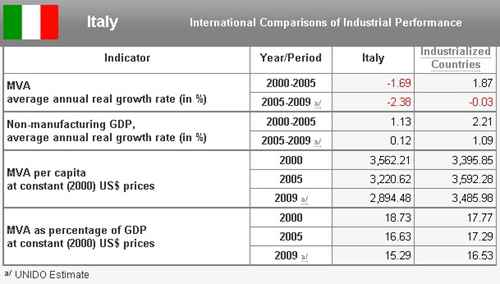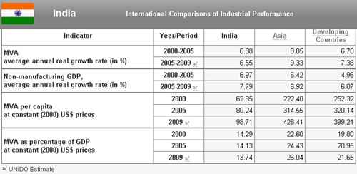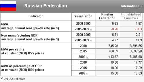 A tabela acima mostra que o PIB industrial per capita no Brasil (Manufacturing Value Added – MVA per capita) em 2009 foi de US$ 594,08. É um valor superior ao da Índia, Rússia e maioria dos países em desenvolvimento. A média do PIB per capita dos países em desenvolvimento em 2009 foi de US$ 282 (sem a China) e US$ 399 (com a China).