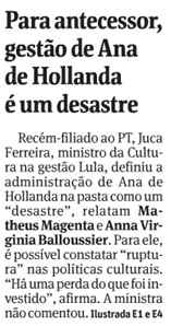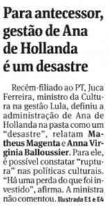 Francamente, eu achei o tal manifesto contra a Ana de Hollanda bem confuso e muito pretensioso, e com muito poucos nomes. Regina Duarte, Juca Oliveira, Jorge Vercillo, Nelson Motta? Pelo amor de Deus! Me pareceu um tremendo golpismo, uma tentativa arrogante de derrubar um ministro para botar em seu lugar um tucano velhusco que não representa nada de novo.