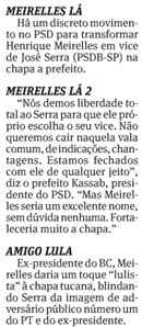 Entretanto, Serra provavelmente só aceite o PSD como vice se este conseguir vencer a disputa no STF para obter tempo de TV. De qualquer forma, seria um belo trunfo de sua campanha apresentar-se ao lado de Henrique Meirelles. O DEM, por sua vez, exige que o PSDB apoie o ACM Neto em Salvador antes de aceitar coligar-se aos tucanos em São Paulo. Ainda não temos pesquisas em Salvador, mas acho que o PSDB deve aceitar a condição, em virtude da prioridade que é a eleição na capital paulista.