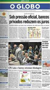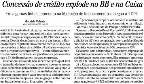 O noticiário econômico de hoje, aliás, é só alegria. Os bancos privados, após suas bravatas, cederam à queda-de-braço e reduziram juros. Não fizeram isso, certamente, por generosidade, mas porque detectaram movimentos de migração em massa de seus clientes para os bancos públicos. Não consegui link para essa notícia, então reproduzo uma fotografia do jornal impresso: