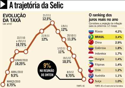 Finalizando com chave de ouro: Com a decisão do BC de reduzir o juro básico de 9,75% para 9%, o Brasil atinge a menor taxa de juro real de sua história: descontada a inflação, o juro real brasileiro está em 3,3% ao ano. Em julho de 2009, apesar da taxa Selic ter chegado a 8,75%, o juro real foi de 3,9%.