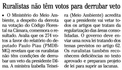 Outro assunto que ganhou destaque na mídia hoje foi a decisão da presidenta Dilma de vetar os artigos do novo Código Florestal, aprovado esta semana no Congresso Nacional, considerados mais “agressivos” em relação ao meio ambiente. E o melhor, segundo cálculos do Ministério do Meio Ambiente (ver nota publicada no Panorama do Globo, abaixo), os ruralistas não tem votos para derrubar o veto.