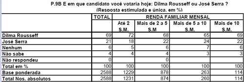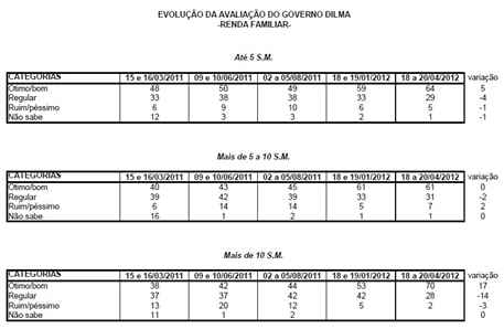 Um dos dados mais interessantes é a evolução da popularidade de Dilma entre os mais ricos. Repare: entre as famílias com renda superior a 10 salários, o percentual dos que acham o governo Dilma Ótimo/Bom saltou 17% nos últimos meses, atingindo 70%. Entre estes, apenas 2% consideraram Dilma ruim ou péssima. Nota-se aí um verdadeiro entusiasmo com o trabalho da presidenta.