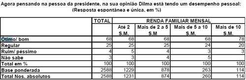É algo inusitado o consenso geral: nenhuma classe social acha ruim ou péssimo o desempenho pessoal da presidenta. Entre os que ganham mais de 10 salários, 78% acham que o desempenho da presidente é ótimo ou bom.