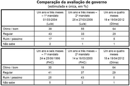 Outro dado interessante é a comparação com Lula. Como esse número já foi badalado na imprensa, chamamos a atenção para um outro ângulo, o percentual dos que acham a gestão da presidenta ruim ou péssima. No mesmo período da primeira gestão de Lula, 17% achavam o governo ruim/péssimo; no mesmo período da segunda gestão, 11% achavam ruim; já no governo Dilma, esse percentual cai para insignificantes 5%. Com FHC, é até covardia, sem comentários.